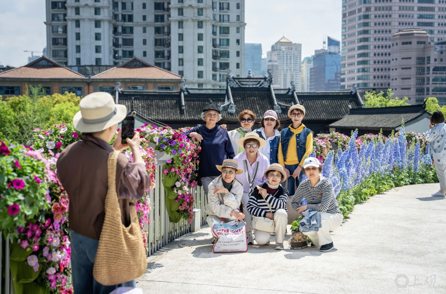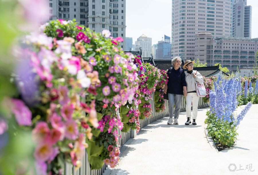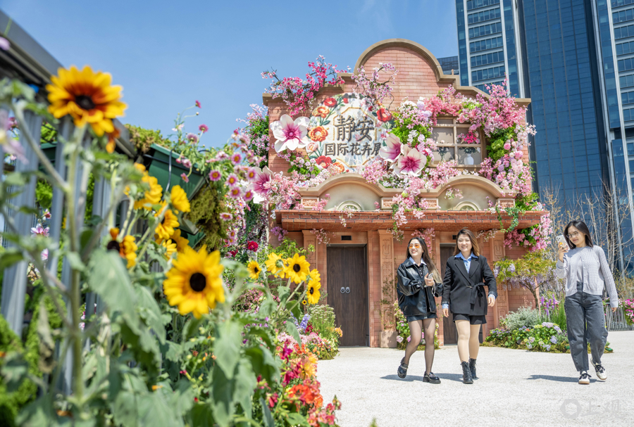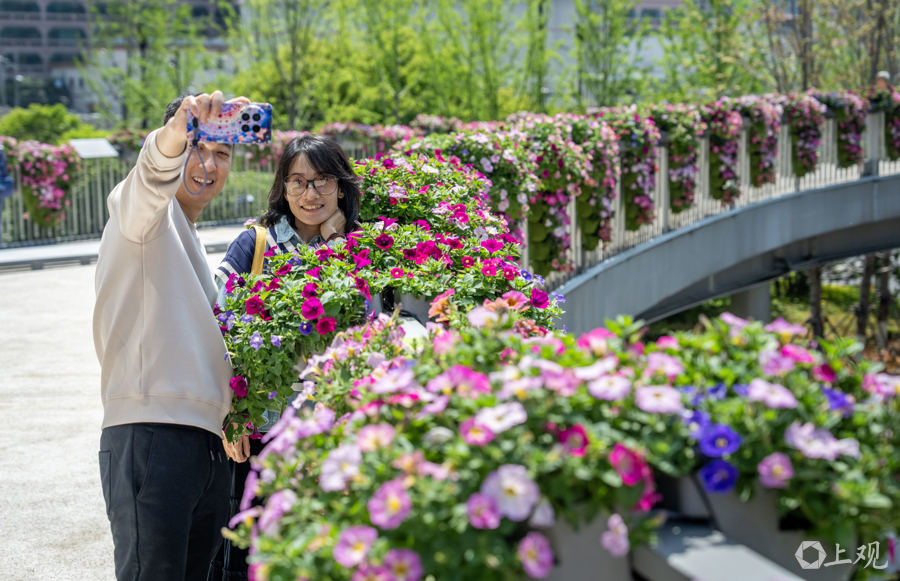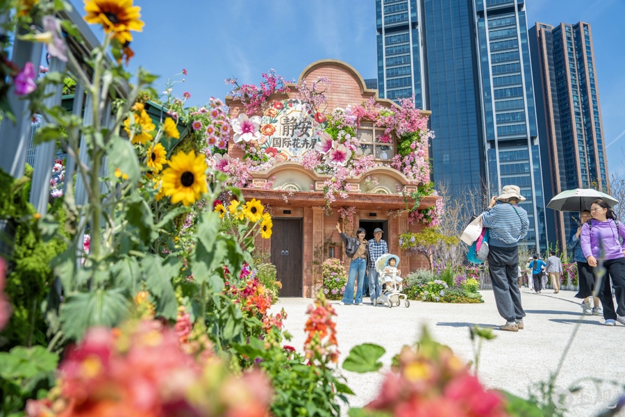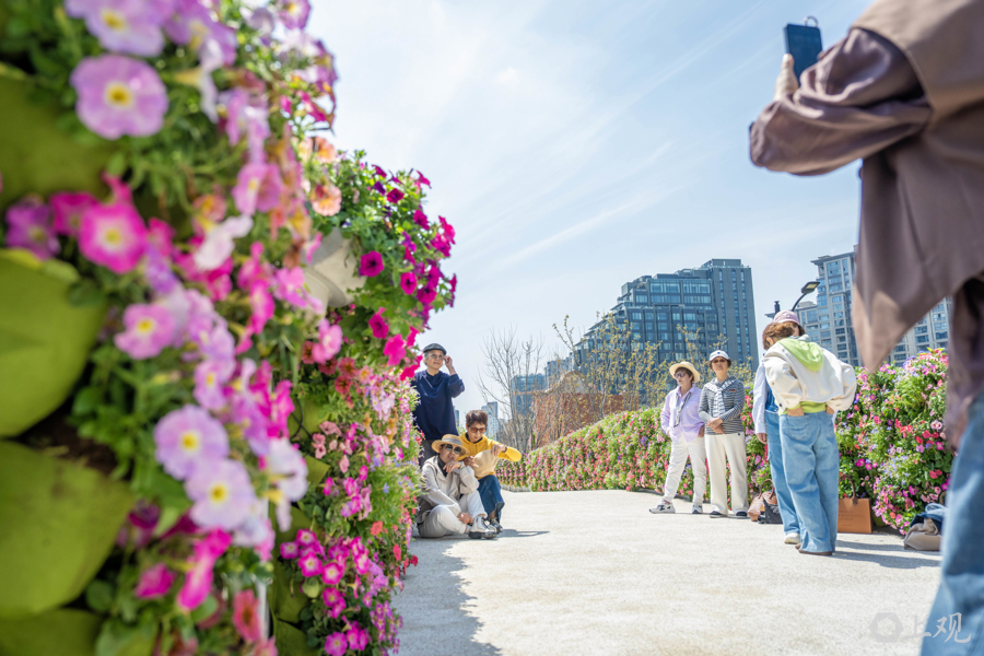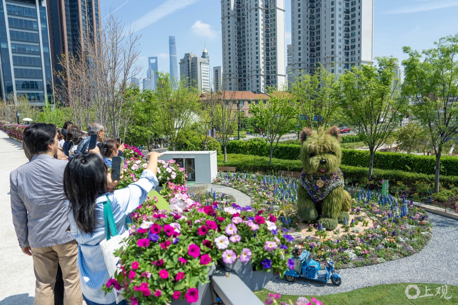 4月18日,2026上海国际花卉节启幕,申城街头被花卉装饰一新。在静安分会场景点之一的苏河湾万象天地附近,过街天桥、绿地均被各类主题花束包裹,更有5.2米高由数万株植物制作的西高地“小狗”。商业空间与花艺巧妙融合,市民、游客纷至沓来。