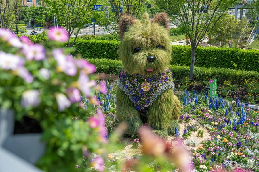 这只花卉“小狗”样式参照西高地品种,高5.2米,由工作人员植入了上万株鲜活植物作为毛发。